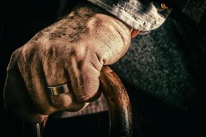 An elderly person's hand holding a cane. Image listed as public domain or other free use by Pikist.com.