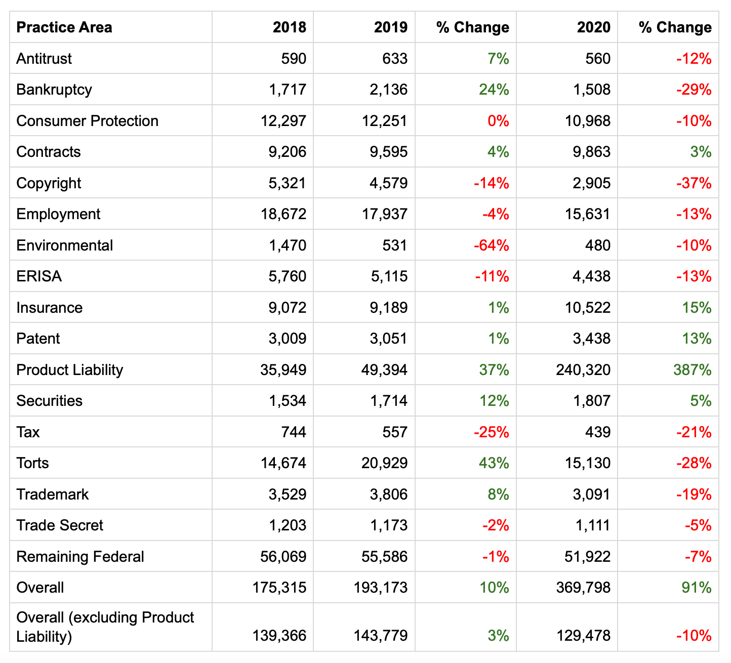 Case filings with percent changes; chart courtesy of Lex Machina.[/caption]Case Filings by Practice AreaWhile case filings excluding Product Liability are down 10% overall, different practice areas fared differently over the last 10 months. As discussed, a large MDL case set in Product Liability concerning ear plugs used in the military resulted in a 387% increase in case filings between 2019 and 2020. While no other practice area had a major increase, a few practice areas did have increases over 2019. Insurance had a 15% increase likely due to business interruption cases as a result of pandemic-related shutdowns. In January through October of 2020, 1,394 business interruption cases were filed versus just 417 in the same time period in 2019. The majority of those (963) were filed in response to the pandemic. Other increases include Patent cases (15%), Securities cases (5%), and Contracts cases (3%). While Securities and Contracts have a significant number of cases attributable to COVID-19, Patent cases may have increased for a few reasons. Cases have increased in the Western District of Texas as it has plaintiff-friendly patent rules that increase speed of case and delay 101 invalidity findings. Additionally, patent owners may be reevaluating their portfolios this year due to increased patent fees and the economic downturn, which may have led to increased conflict over valuable patents. Copyright had the biggest drop-off in case filings with a 37% decrease compared to 2019. Large numbers of Copyright cases are filed by a small number of companies in file-sharing cases (claims of infringement for BitTorrent/P2P file sharing brought against anonymous John Doe defendants or anonymous defendants' IP addresses). These cases specifically dropped off in the first two quarters of the year. Lex Machina tracks cases in federal district courts, and Bankruptcy cases decreased 29% since 2019. We expect to see more Bankruptcy litigation make its way to federal court as a result of the pandemic in the coming years. Torts cases decreased 28% compared to 2019, but were more on par with the number of Torts cases filed in 2018. This pattern may be due to a large number of related cases filed in 2019 surrounding the opiate epidemic. Pandemic-related Torts cases may make their way into federal court as they get closer to the statute of limitations or cases are removed.Case Filing by Practice Area Including Percent Changes[caption id="attachment_733056" align="aligncenter" width="640"]