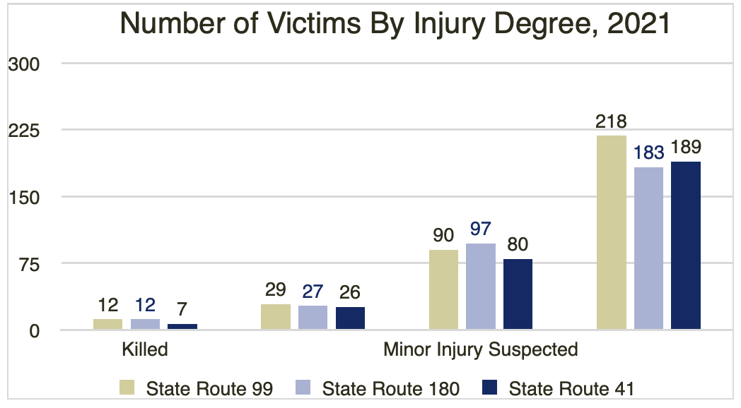 Collisions by PCF; chart courtesy of author.[/caption]Measuring the Impact of Fresno County Highway CrashesOne of the most important metrics for measuring the severity of a collision is the impact on its victims. Serious injuries can require “emergency services, surgeries, hospitalizations, doctor appointments, physical therapy,” and other long-term medical necessities. Even a seemingly minor crash can take a mental toll on a victim’s health, while potentially also causing lingering injuries that can last for years or even a lifetime.In the following graph, we track the number of victims by injuries reported during a crash. Routes 99 and 180 both had 12 fatalities through 2021, but the 99 had slightly more serious injuries over the year. Route 41 had the fewest injuries reported in all categories except crashes where there were possible injuries, where it had 6 more cases than Route 180. [caption id="attachment_4821859" align="aligncenter" width="600"]
