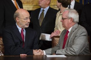 Pennsylvania Gov. Tom Wolf, pictured left, has spoken out against the Berks County Detention Center. But his critics say his words have been empty. Image via Flickr/user:governortomwolf. (CCA-BY-2.0).