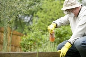 A man sprays household pesticides on garden plants. Image claimed as public domain on FreeStockPhotos.biz -- credit to the Center for Disease Control and Prevention.